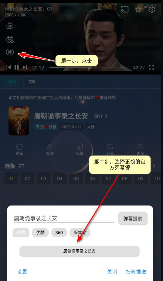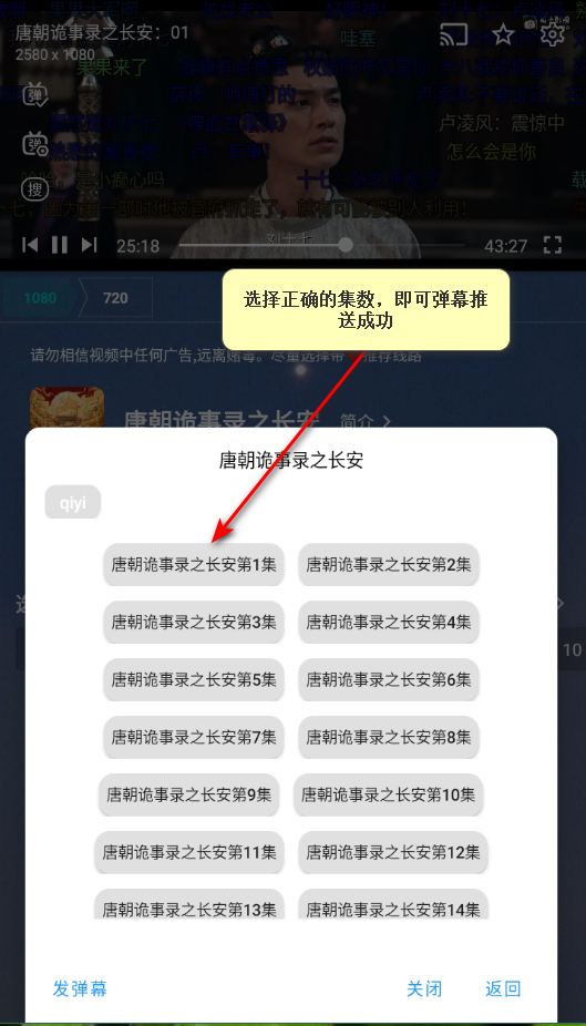 加载官方弹幕步骤为:点击“搜”,字,会出现如下图,自动填入片名(如自动填入不准确,可自己修正),然后选择正确的来源,点击正确集数,即可加载弹幕成功